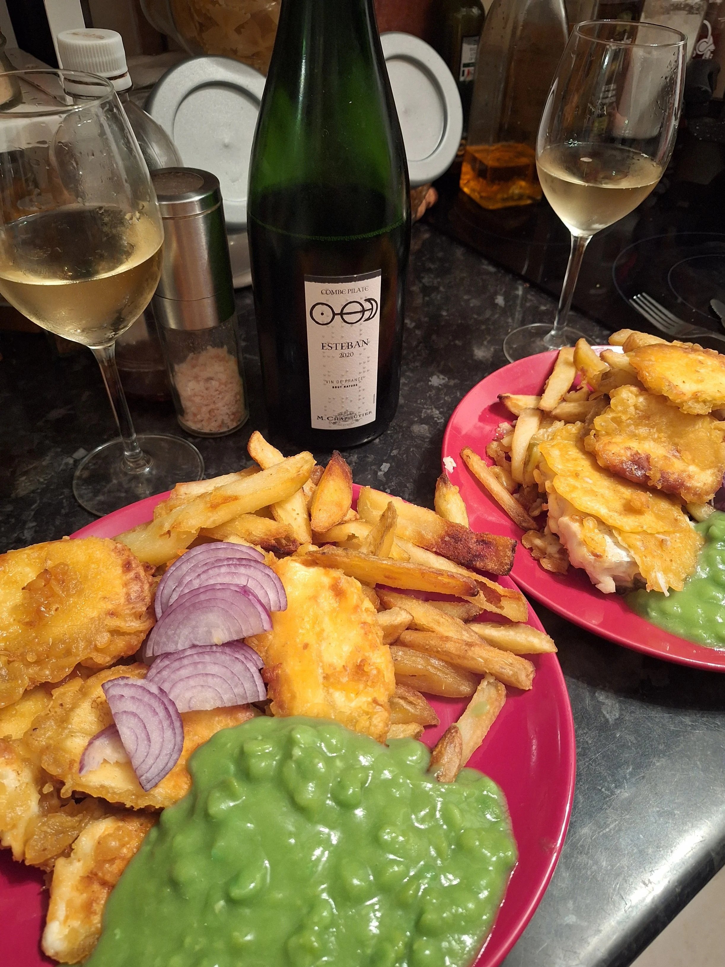 Beer-batter enriched cod (Henry) or Halloumi (Nicola) with crisp and light-brown chips made from slow-cooked, home-grown potatoes. Add compulsive shop-bought (but never own brand) mushy peas, lashings of vinegar and salt, and, rather intriguingly, chopped raw red onion too (it goes well with the Halloumi, apparently).