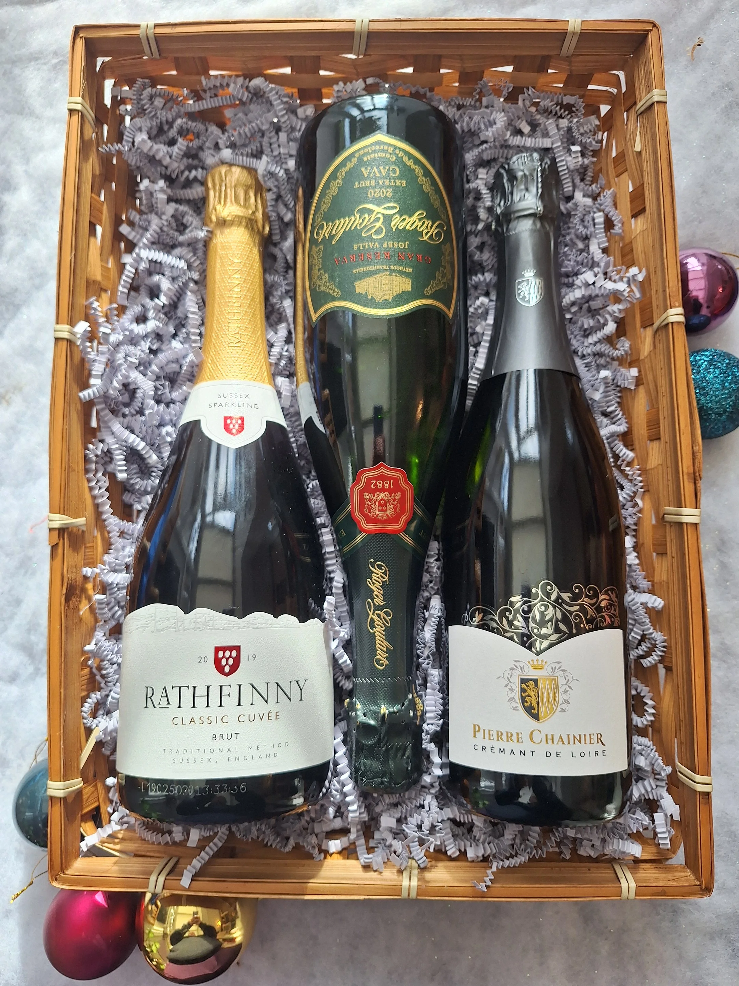 Our hampers include either two or three bottles of wine (with room for a wedge of cheese or two) nestled in purple packing paper in a wicker basket, wrapped in biodegradable cellophane and finished with a ribbon.