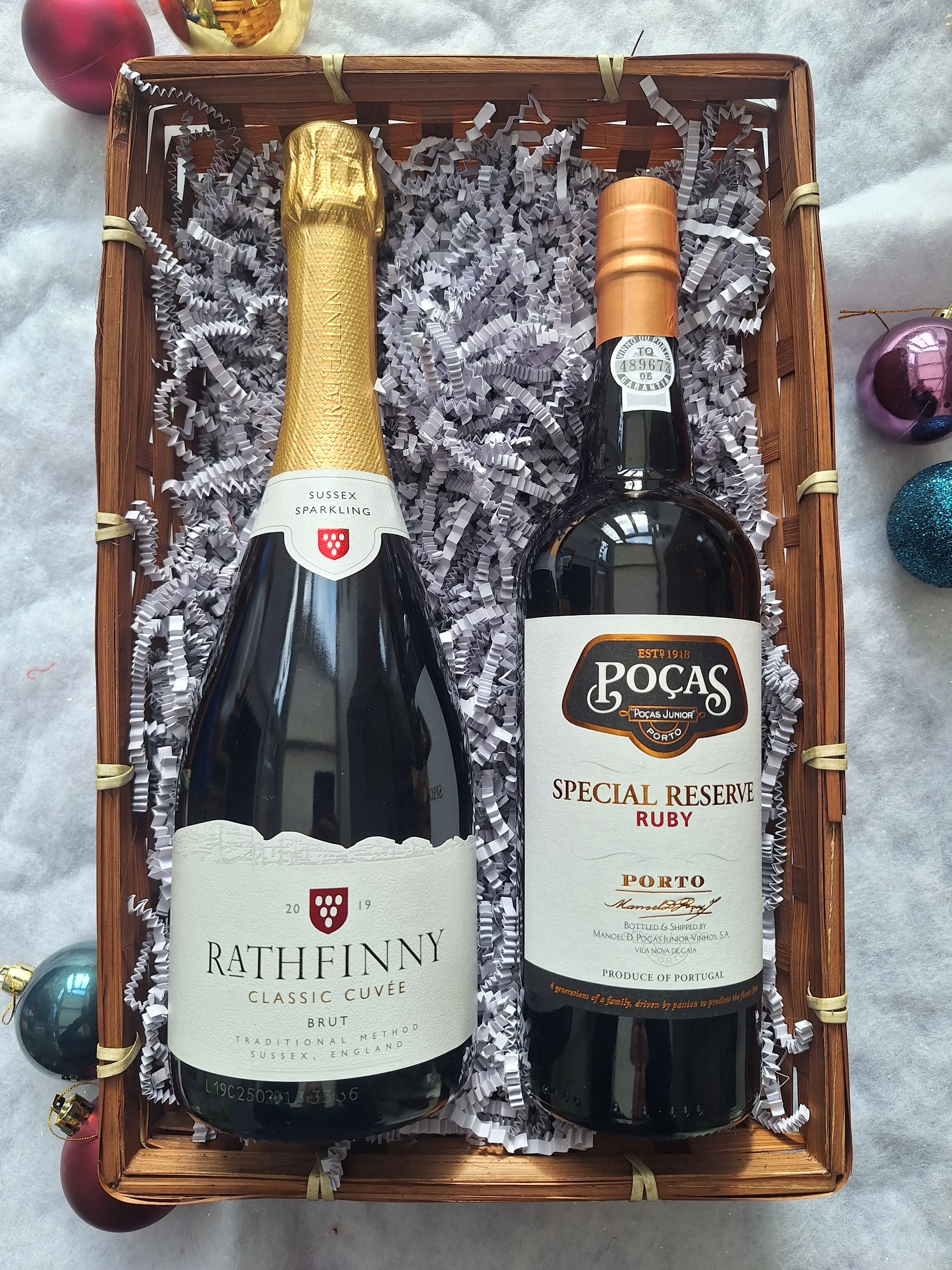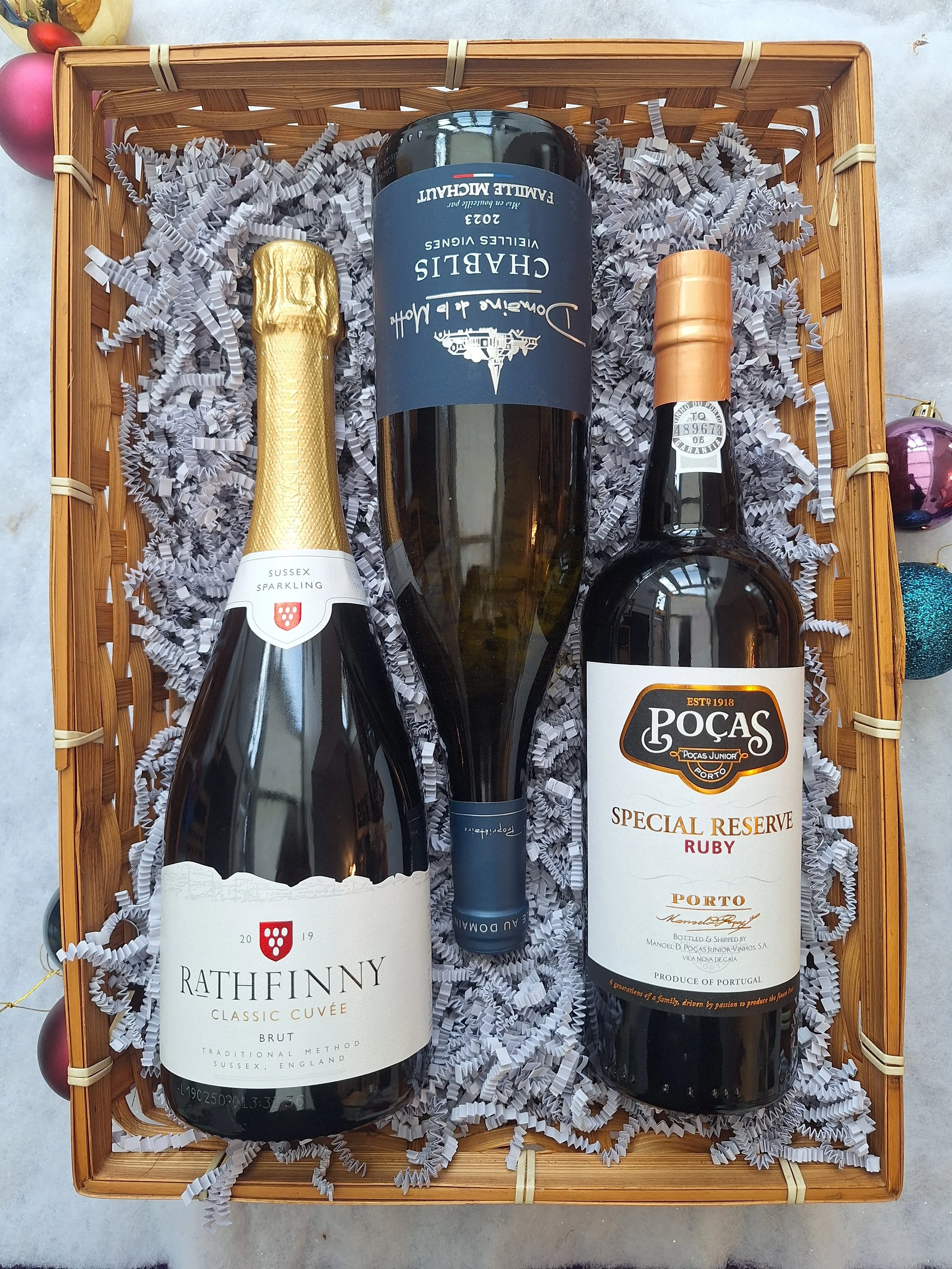 Two or three Christmas Classic wines in a hamper basket, wrapped in biodegradable cellophane and finished with a ribbon.