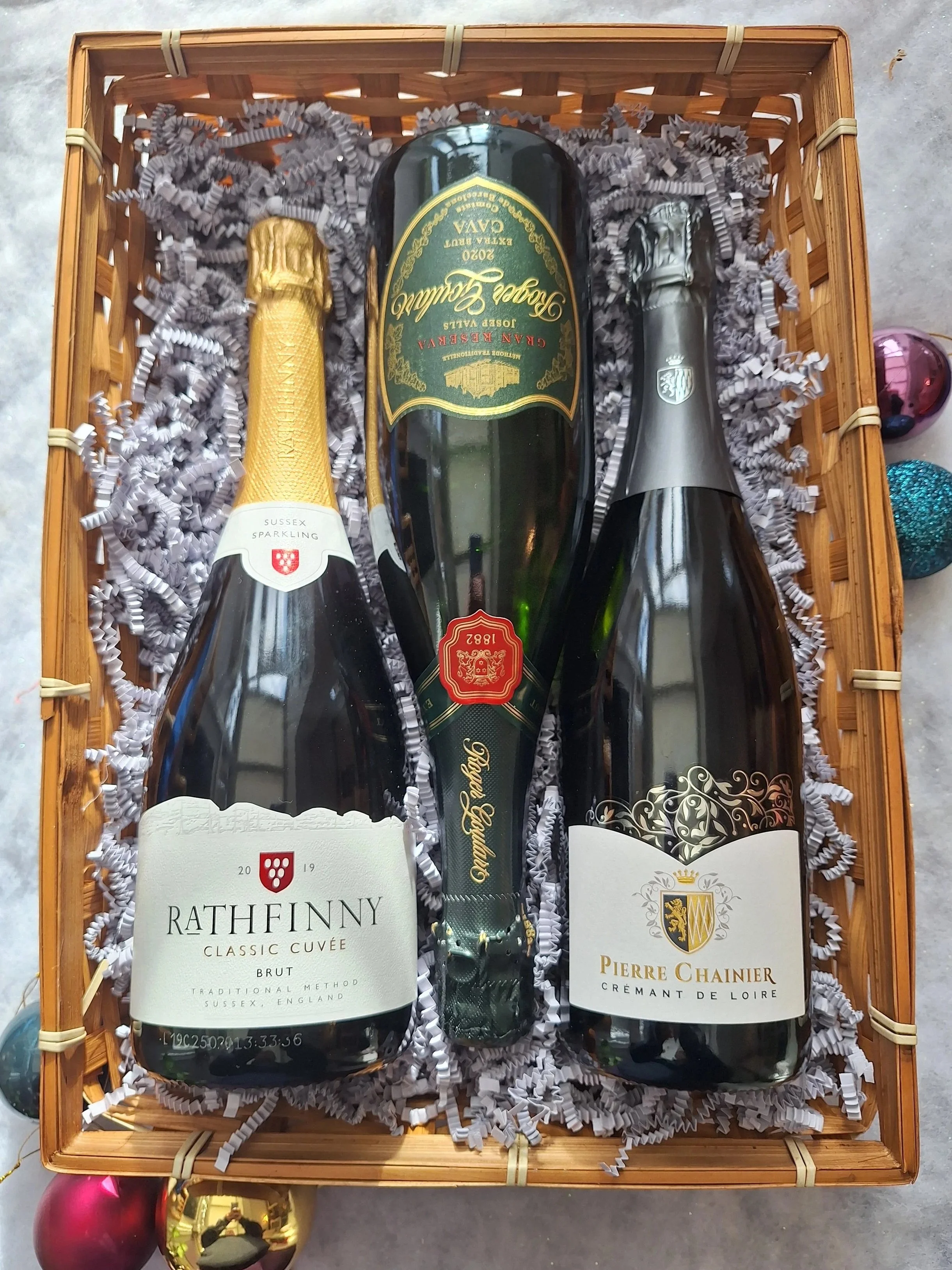 Two or three of our most popular sparkling wines, wrapped in biodegradable cellophane and finished with a ribbon.